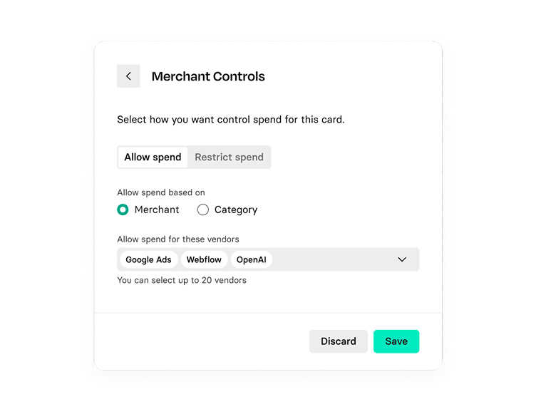 Set limits, merchant restrictions, and approval flows that align with your team's real spend—no extra software needed.