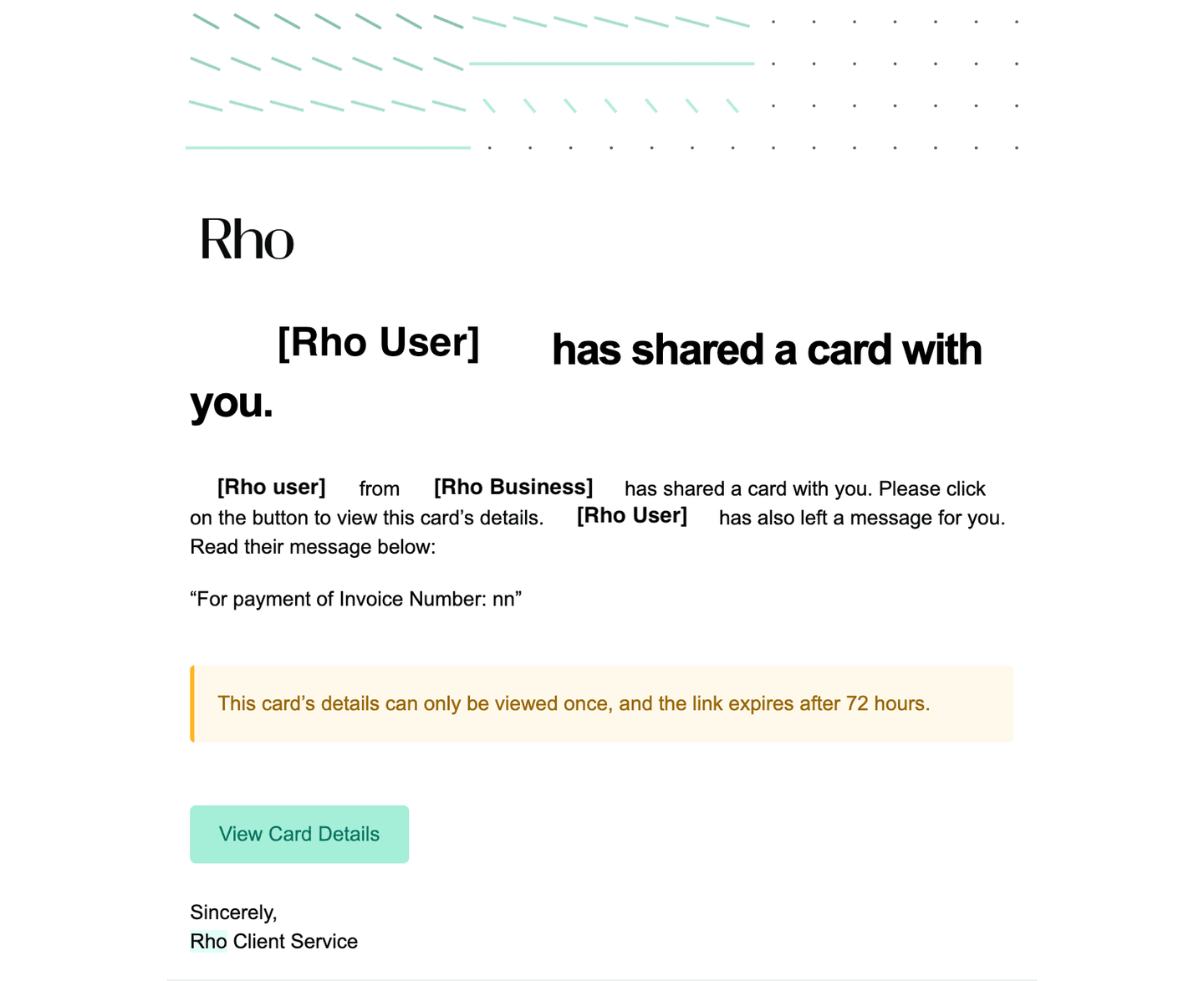 Vendors will see the payment creator, organization sender, invoice number, as well as the card details needed to approve payment.