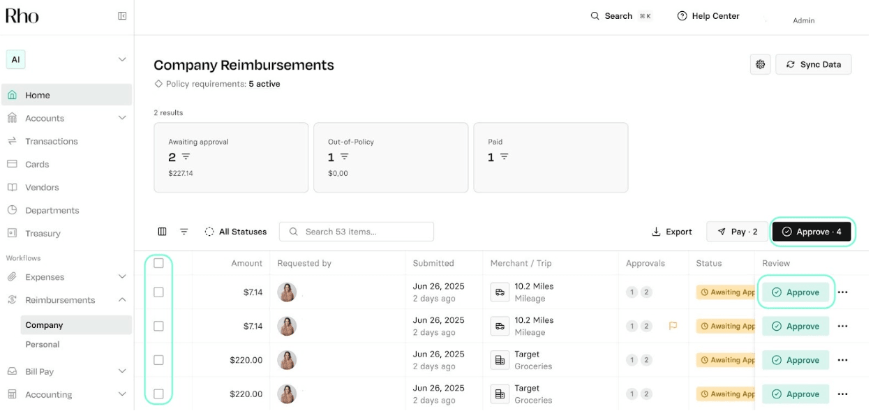 Rho users with expense approval permissions can review reimbursement requests and approve or reject them, similarly to other expenses flowing from a Rho Card.