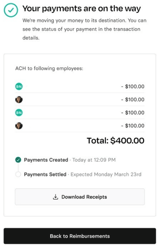 To pay reimbursement requests (send funds to employees via ACH), users with payment permissions can navigate to the Reimbursement tab, and either click on Pay next to individual items in the table, or select multiple items by checking the boxes on the left, and perform a bulk payout by clicking the Pay button above the table.