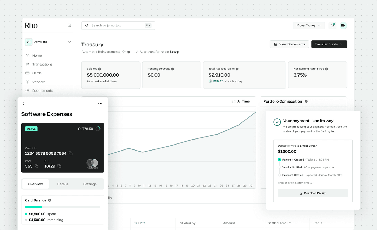 Either way, choosing a platform with zero platform fees and built-in treasury access is the more durable decision. (For Rho, Treasury access requires a $50K minimum; multi-asset access requires a $100K minimum.) The specific yield number changes with the Fed; the structural advantage of having yield integrated into your banking platform does not.