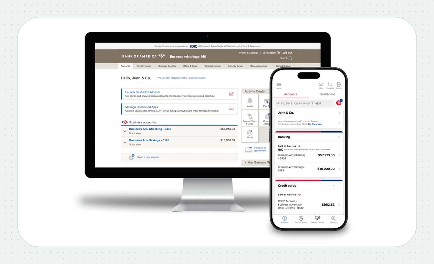 Bank of America offers checking and savings, credit cards, bill pay, startup-friendly lending, and investing tools.