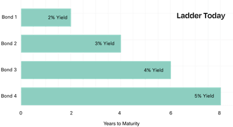 Remember that with bond ladders, you invest in multiple bank certificates of deposits (CDs) or bonds with different maturities. As each bond matures, you reinvest in a new bond with the longest maturity you picked for the ladder.