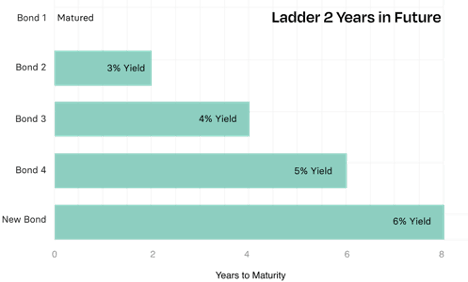 Two years in the future, Bond 1 matures, and it's time for you to reinvest that money in a new bond at the maximum maturity. In this example, rates rose. You would continue this process for as long as you wanted the ladder in place.