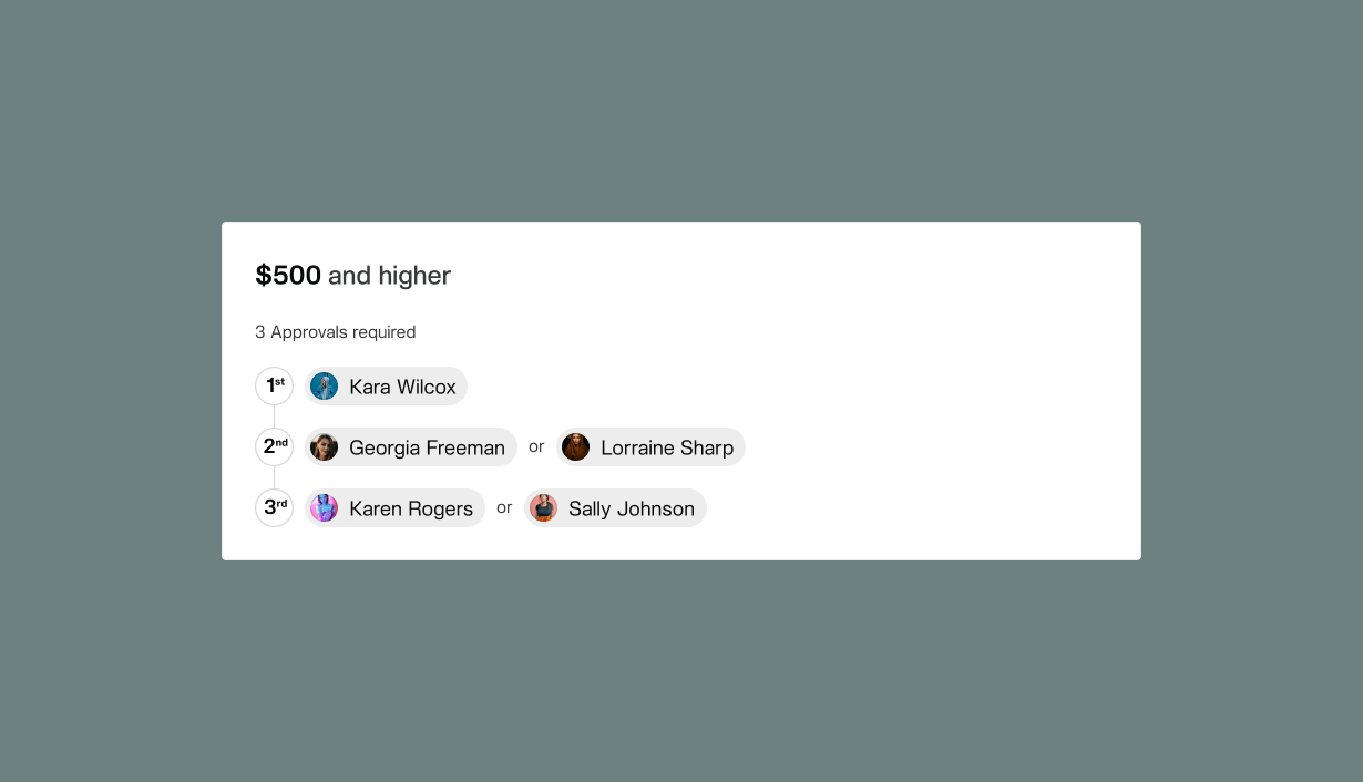 Previously, you could configure approval workflows to assign a single expense approver based on dollar thresholds. For example, expenses above $100 require your manager Jason's approval, and those above $250 require the CFO Michelle's approval.