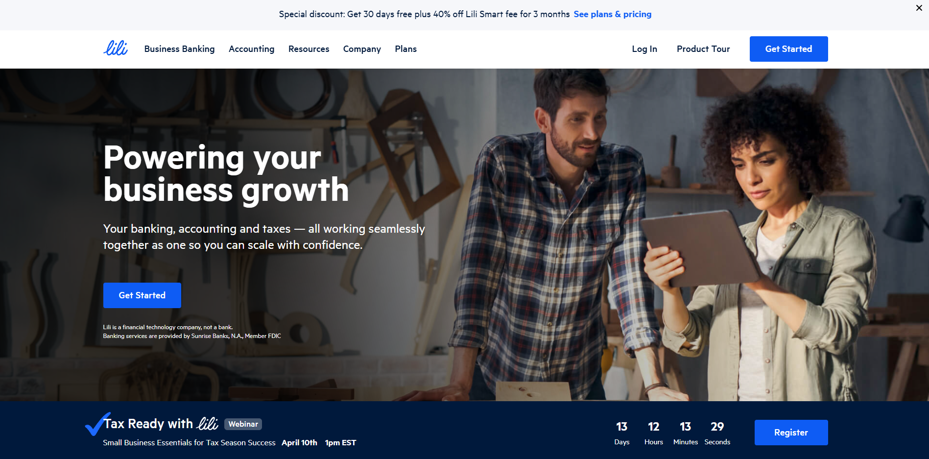 Lili Smart: $21/month - Advanced Business Checking, Debit Card with Cashback, Fee-free ATM withdrawals, Early payment, Wire transfers, Fee-free Overdraft, High-yield Savings, Multiple teammate access, Comprehensive Accounting, Tax Preparation.