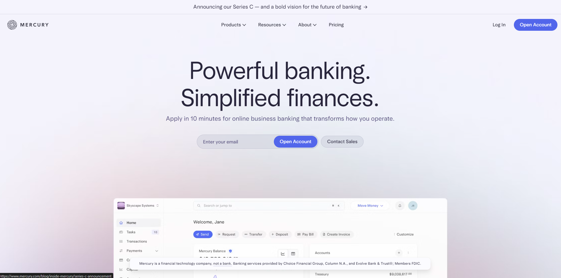 Mercury provides online business banking tailored for startups and small businesses. Their main value proposition is "Powerful banking. Simplified finances." They aim to transform financial operations for startups, small businesses, entrepreneurs, and founders by offering efficient and secure banking services.