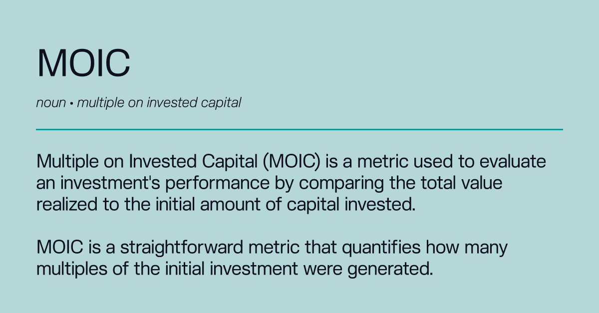 MOIC measures how many times the initial investment amount was multiplied by the returns generated.