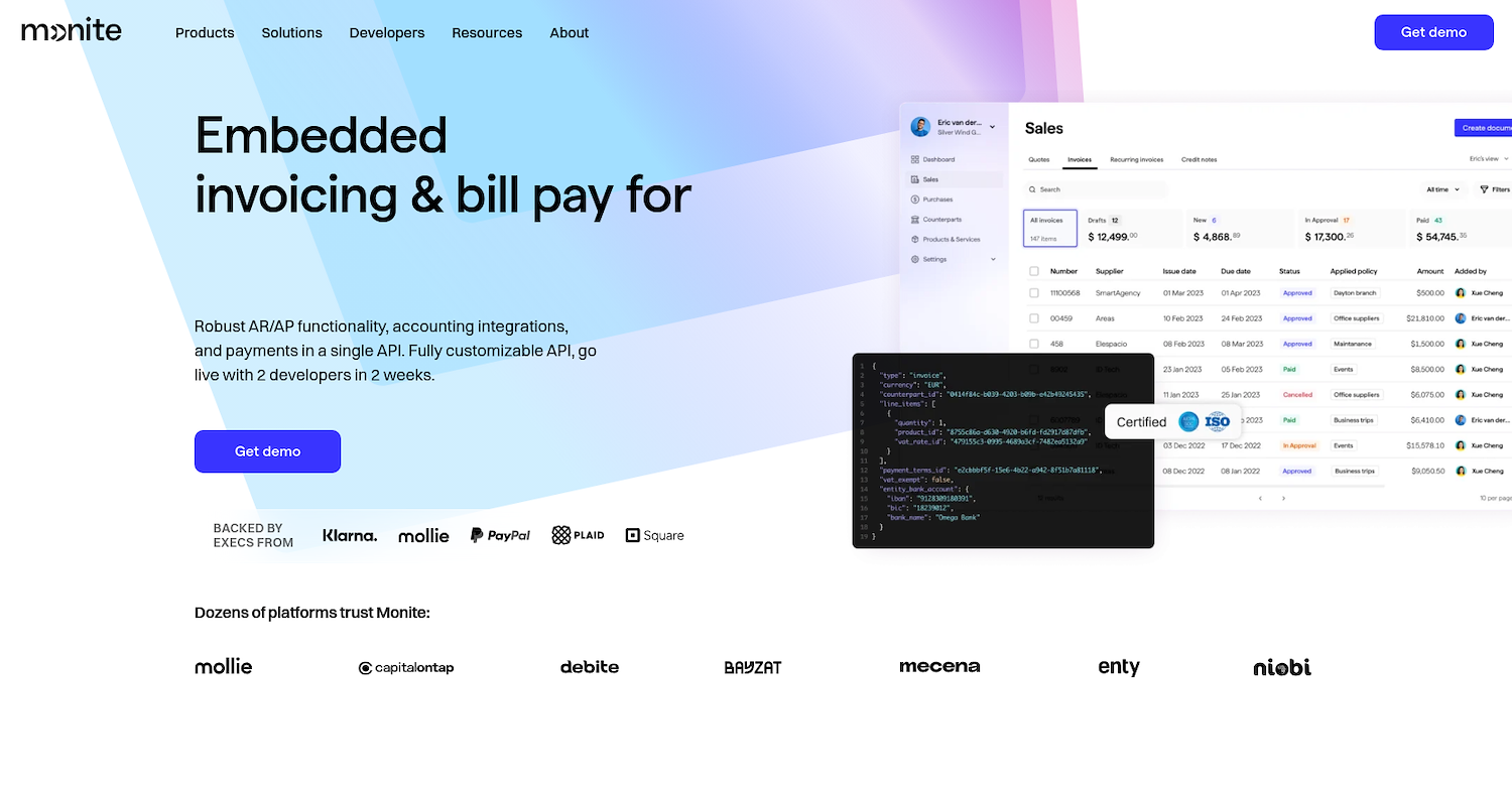 Monite offers financial administration automation solutions, including invoicing and payables automation, to help businesses streamline their financial processes. Their products include AR Automation, AP Automation, Bill Pay, Payment Links, and AI-OCR & Data Extraction, designed to integrate seamlessly into existing platforms and provide robust AR/AP functionality, accounting integrations, and payments through a single API.