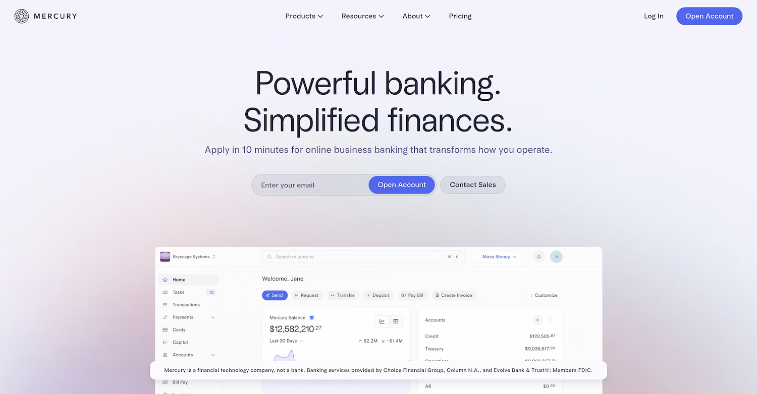 Mercury is a financial technology company that offers online business banking services tailored for startups and small businesses. Their platform includes FDIC-insured bank accounts, seamless payment processing, early access to credit cards with cashback, and advanced financial workflows such as bill pay, invoicing, expense management, and accounting automations.