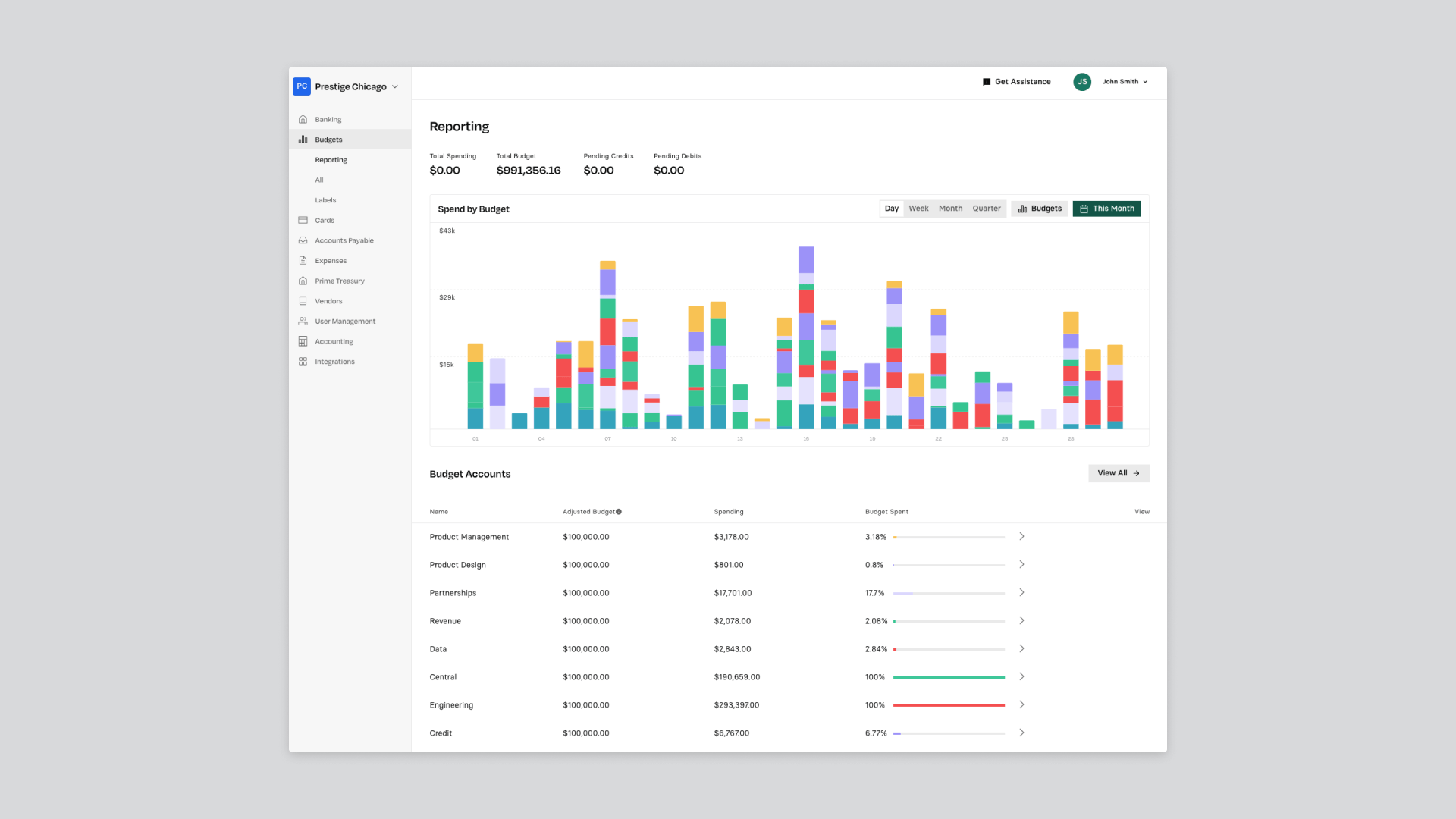 As you spend, the Reporting view provides a visual and numerical summary of spending across your configured budgets, letting you know how you are progressing against your pre-set limit. Having that information helps inform future budgeting decisions, measure how you are progressing so you can keep an eye on your margins, and uphold accountability.