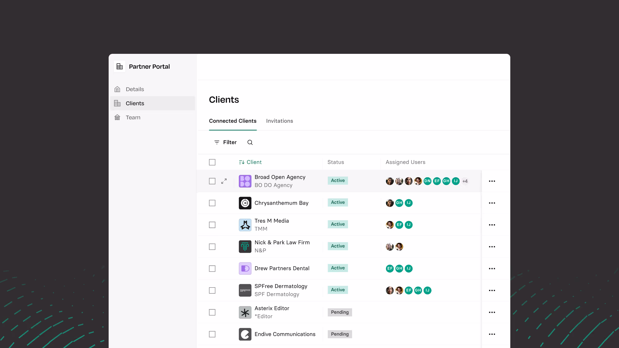 Streamlined client management: Request client account access, set user permissions, and manage connections from a single dashboard.