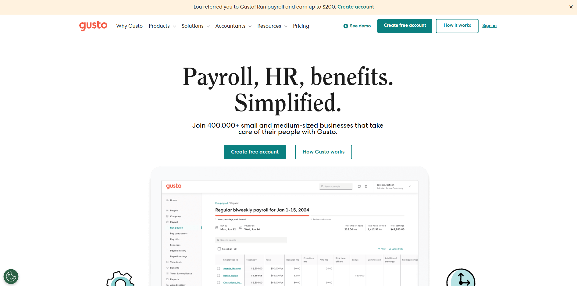 Gusto provides online payroll and HR solutions tailored for small to mid-sized businesses. Their main value proposition lies in simplifying payroll, HR, and benefits management, making it easier for businesses to handle these tasks efficiently. Gusto is particularly popular among small businesses, startups, and contractors-only operations.