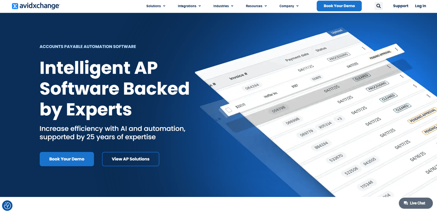 AvidXchange offers accounts payable automation software and services designed to increase efficiency, visibility, and control in the AP process. Their solutions leverage AI and automation, supported by 25 years of expertise, to help finance teams transform the way they receive, manage, and pay bills, integrating seamlessly with over 200 accounting systems and ERPs.