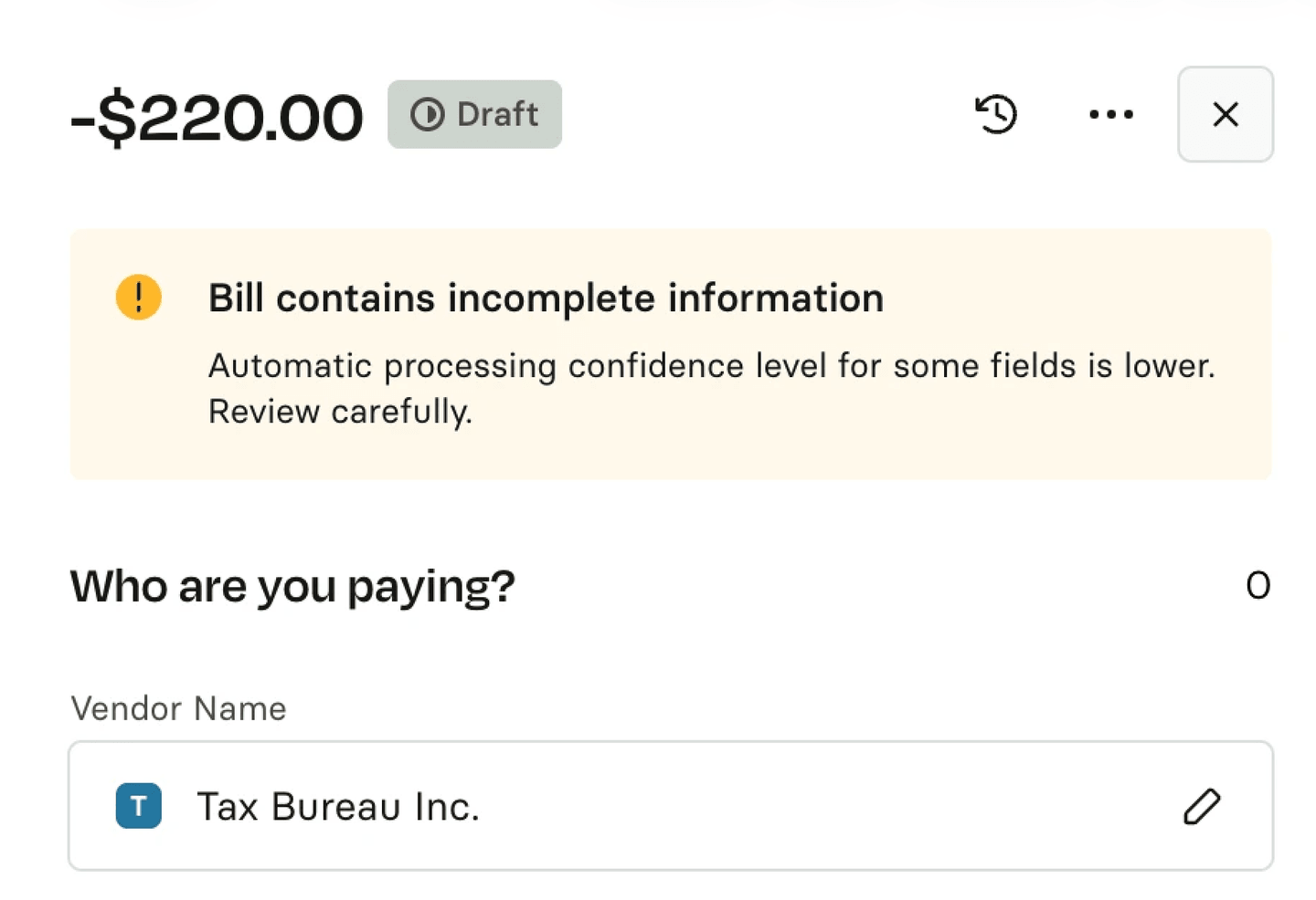 A lower confidence score will be indicated by the yellow inline warning, which, when clicked, will showcase additional information on what needs to be checked: