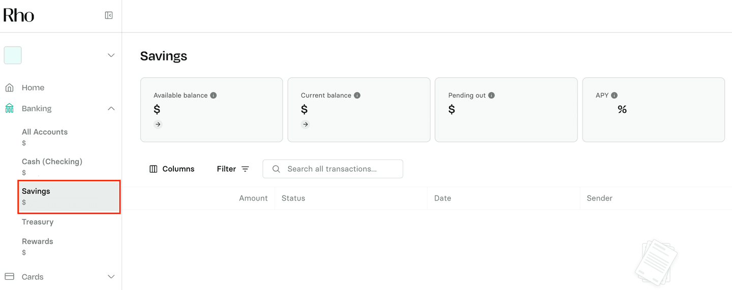The balance of your Rho Savings Account displayed in the navigation of the Banking tab and in the Savings account page.