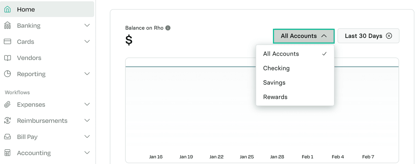 You can quickly see the total balances across all your Rho accounts right from the Home tab using the dropdown widget: