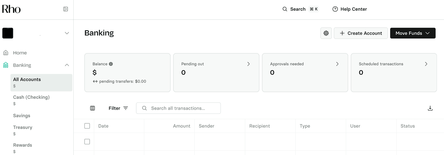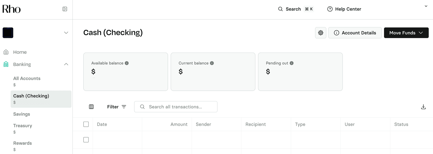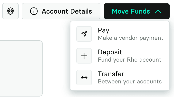 Click Move Funds to make a payment, deposit funds, or transfer funds between Rho Checking, Savings, and Treasury Accounts.