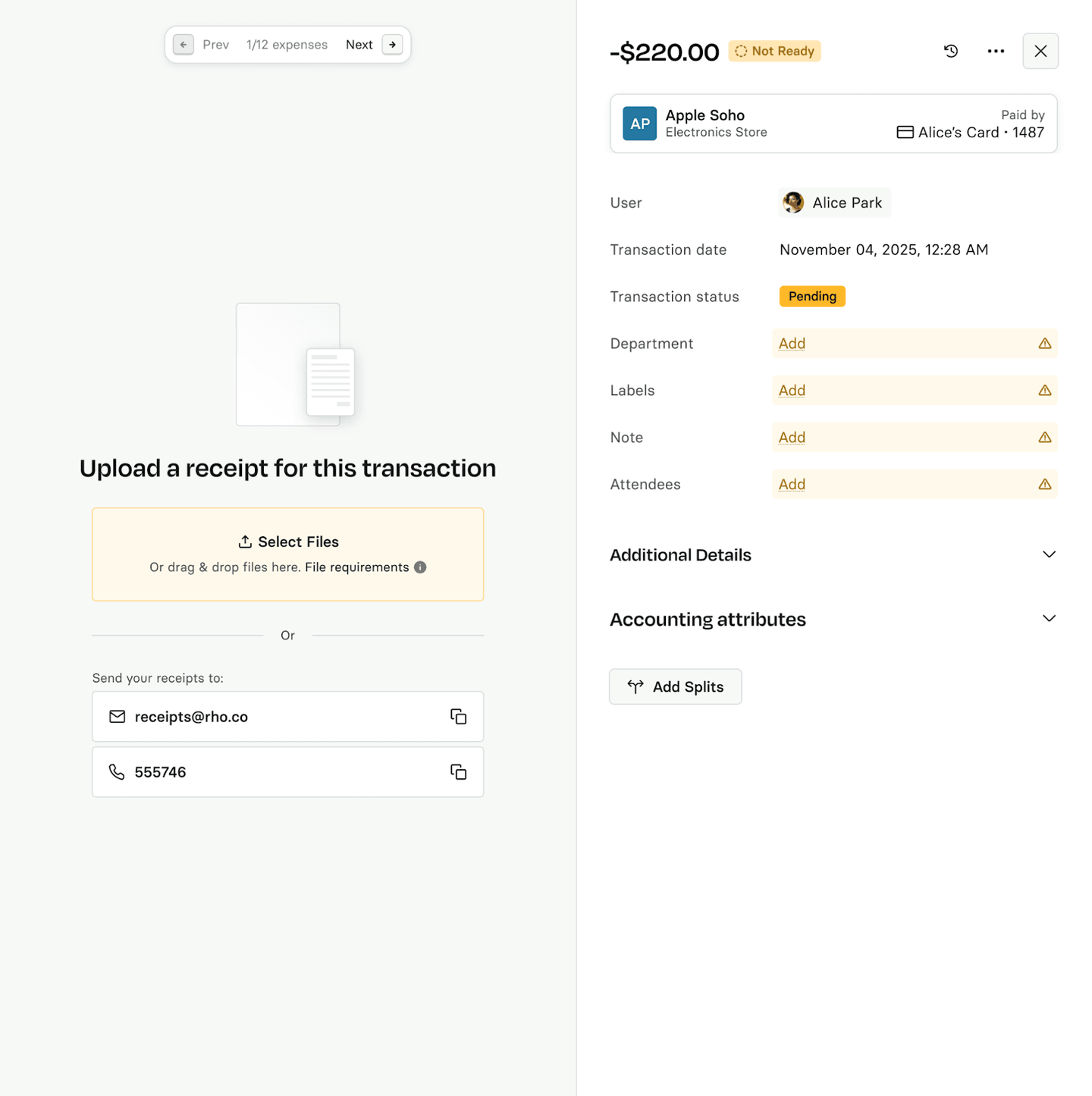 Forward receipts to receipts@rho.co. Rho automatically matches each receipt to the correct transaction.