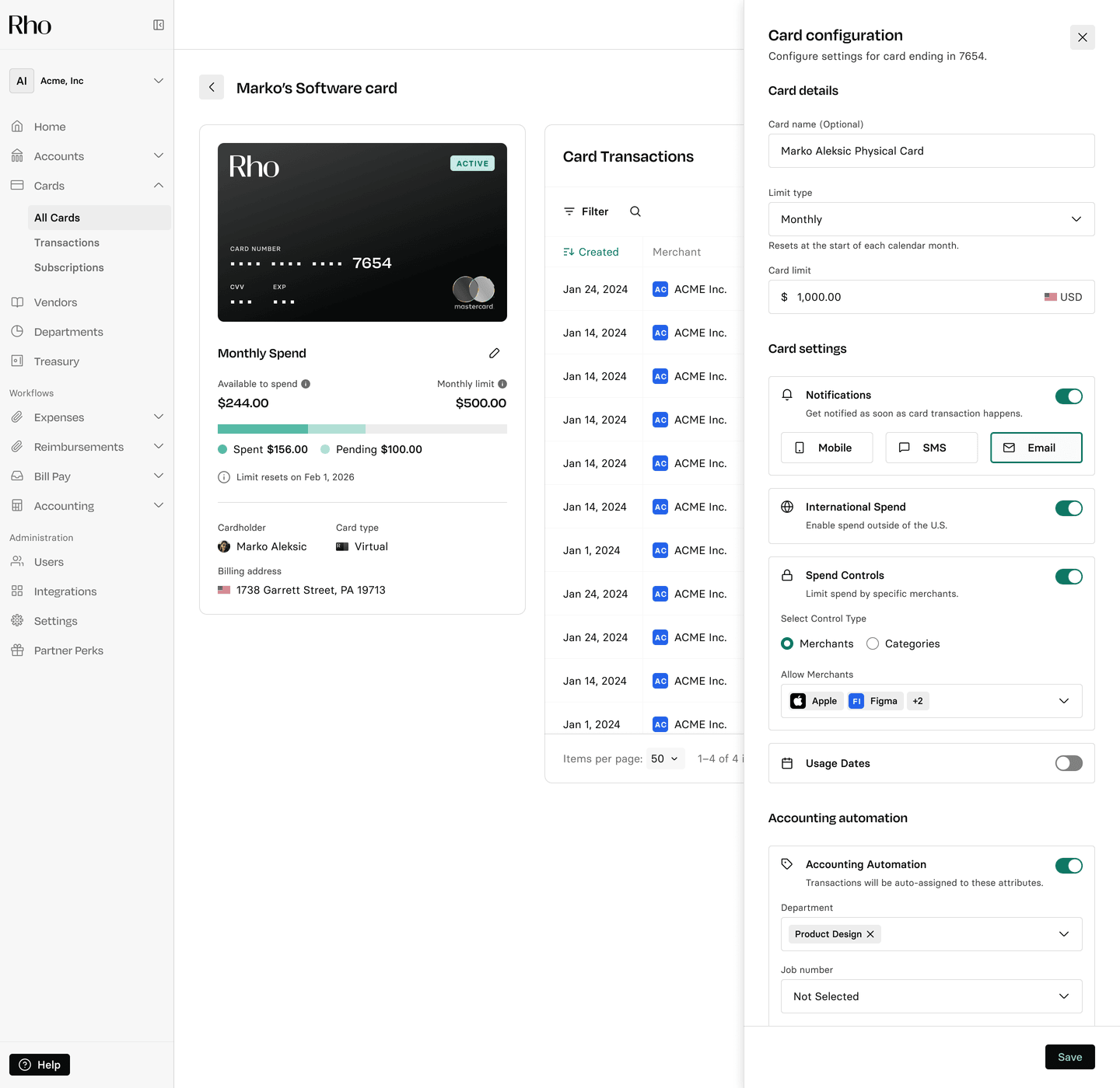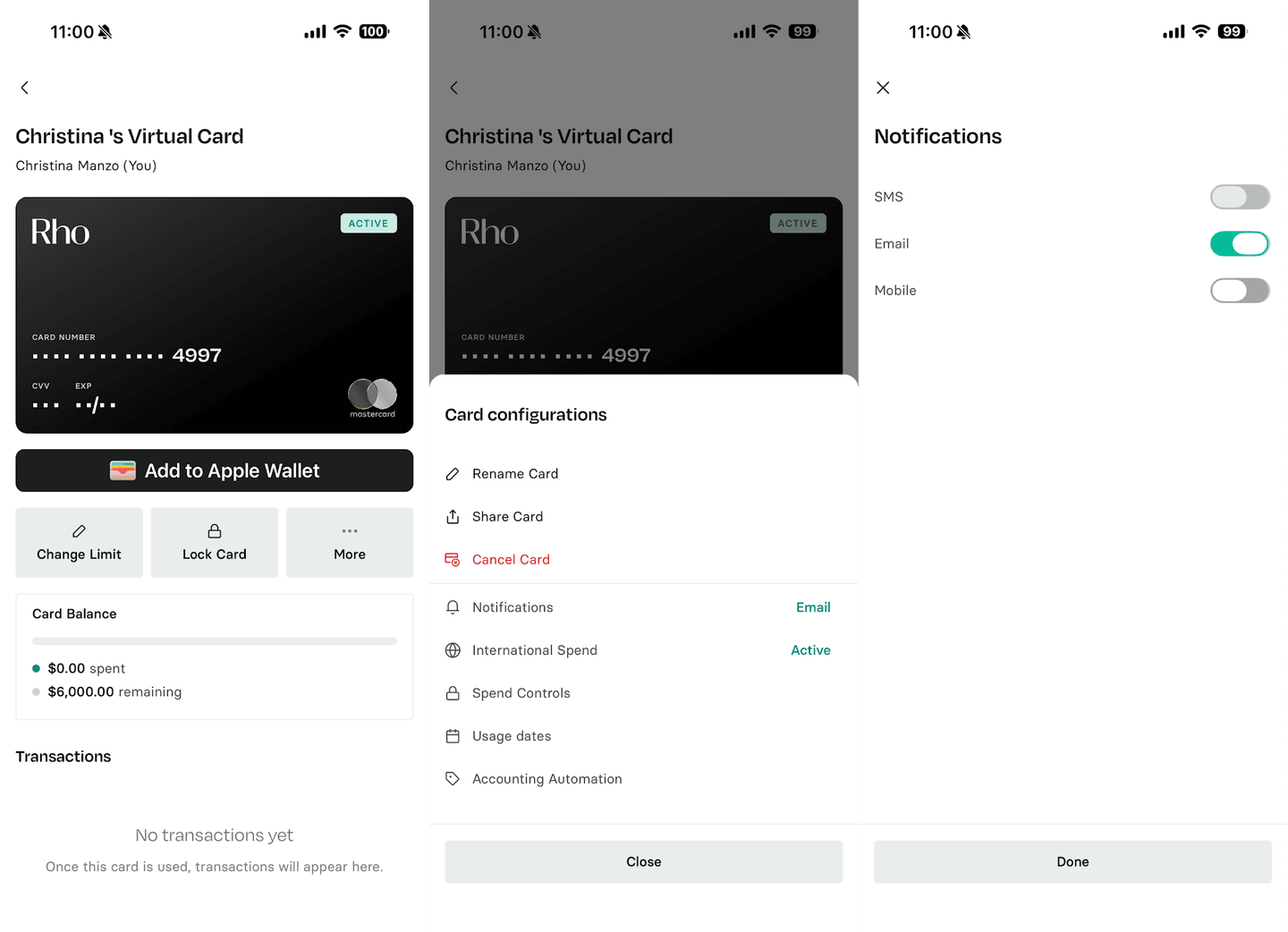 When notifications are enabled, Rho sends a text or email after each approved card transaction.