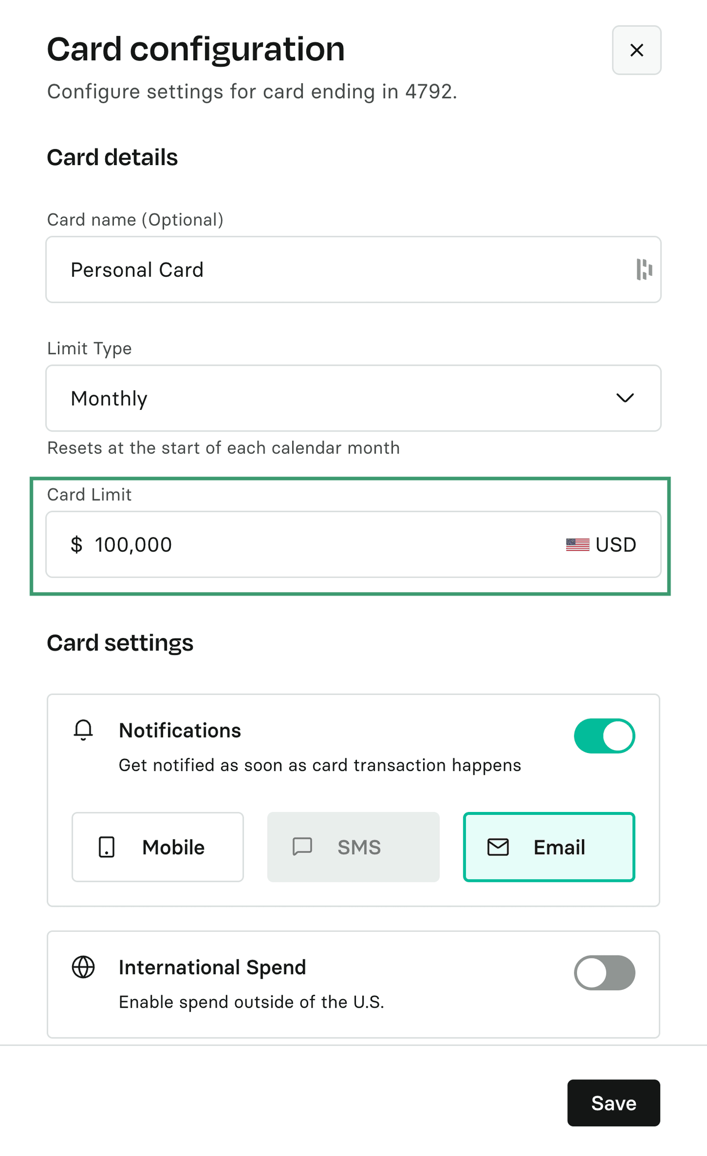 When you enter "0" as the card limit, it implies that the card has no spending limit. You will see a warning message in the card limit modal during both the card creation and card settings processes, alerting you that setting the limit to "0" effectively removes any spending cap on the card.