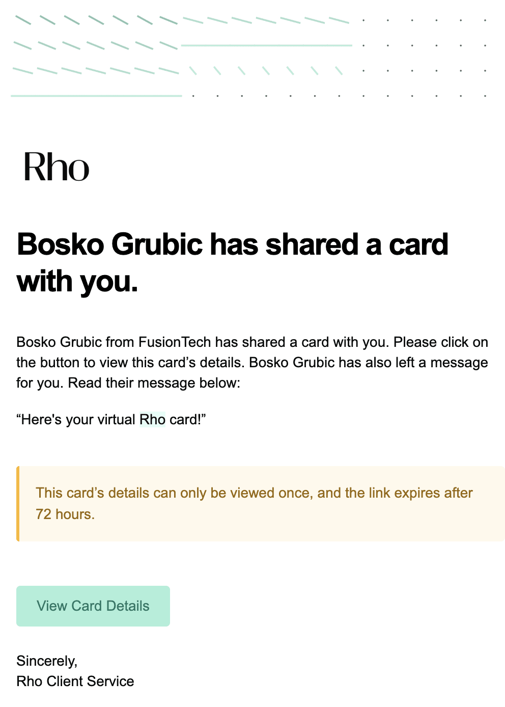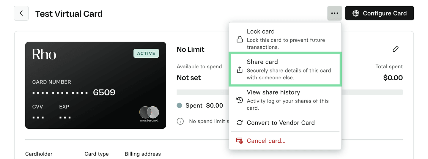 If you need to share your Rho Virtual Card details with someone, there's a secure way to do so within the Rho platform.