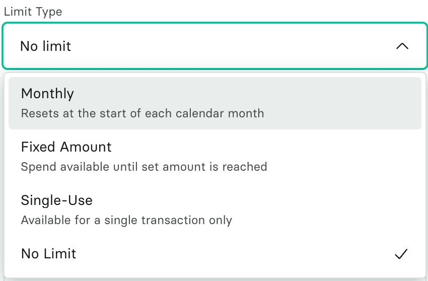 Note: If you have a user limit, your card limit cannot exceed that amount. User limits are set by Admins and Account Owners. Learn more about user limits here.