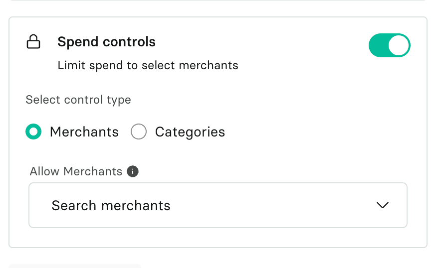 Merchant-specific controls: You can limit a card's acceptance to a group of up to 20 distinct merchants. This means the card will only be accepted at those merchants, and transactions at merchants not on that list will be declined.