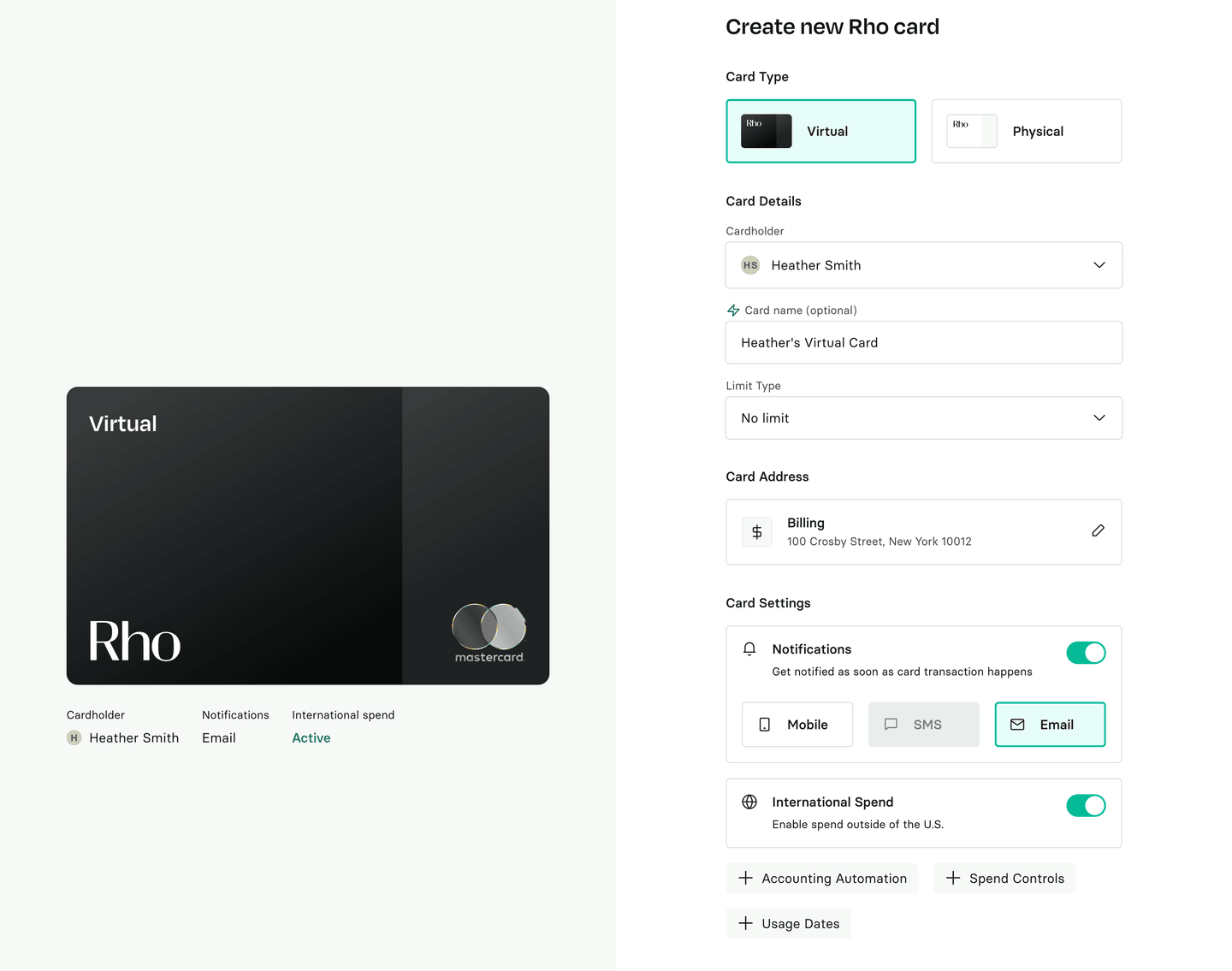 Merchant category controls: You can limit a card's acceptance to specific merchant categories (ex. Advertising Services, Airlines, Grocery Stores), which are set by Mastercard, the network partner for Rho Cards.