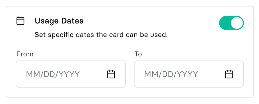 You can set up custom active dates for your card, meaning that it can only be used between specified days. Note: By default, all Rho cards expire 3 years from issue date.