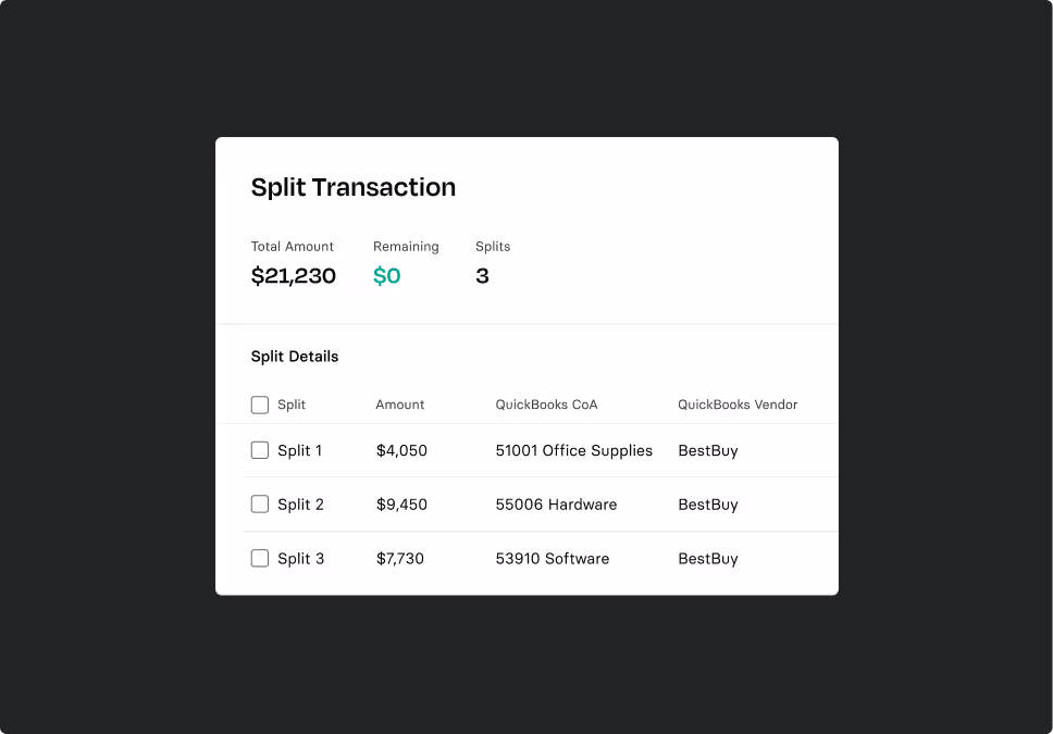 Easily split a single AP or banking transaction into many — across your Campfire Chart of Accounts & Vendors.